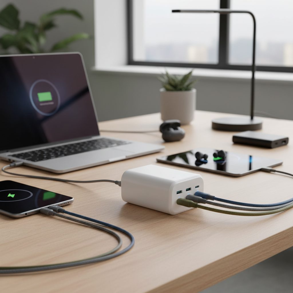 沖縄でリモートワークをしている方は、ノートPC・外部ディスプレイ・スマホ・ワイヤレスイヤホンなど複数デバイスを同時使用することが多いです。GaN充電器1台で複数デバイスをまかなえれば、デスク周りのコードが減りスッキリします。